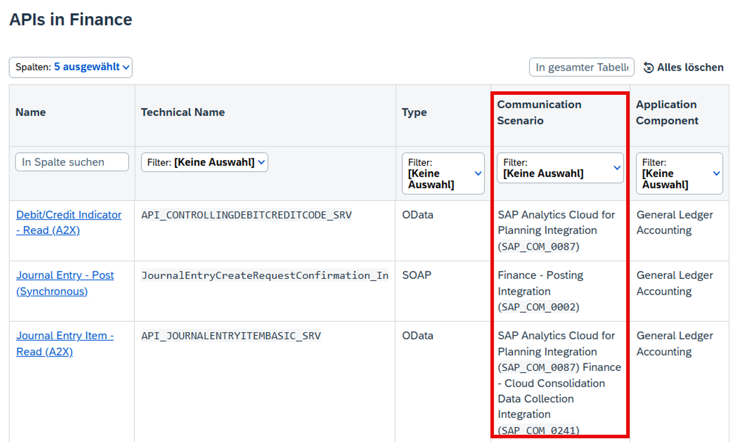 Kommunikationsszenarien bündeln ein- und ausgehende APIs bzw. Services, die für bestimmte Prozesse erforderlich sind. Jede Kommunikationsvereinbarung muss auf einem Kommunikationsszenario basieren. Für alle Standard-APIs stellt SAP S/4HANA Cloud vordefinierte Kommunikationsszenarios bereit. Zum Beispiel für Finance.