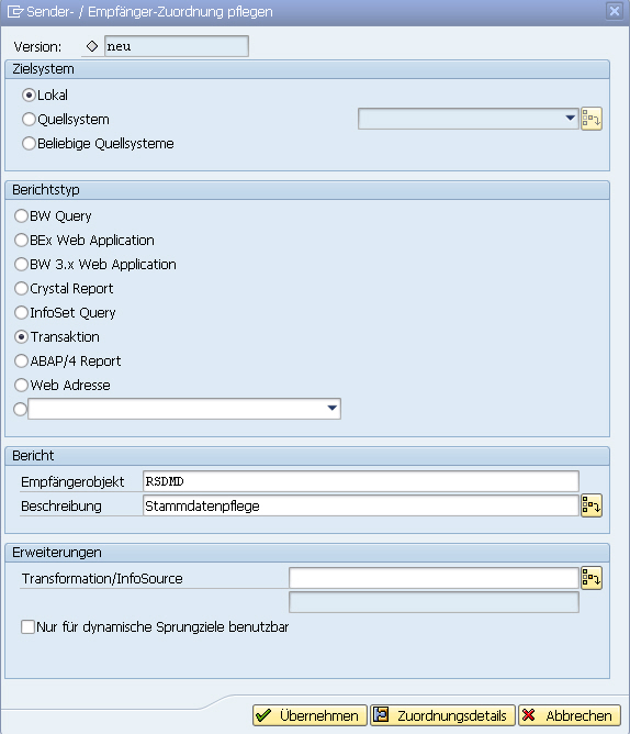 Führen Sie zunächst die Transaktion RSBBS – Pflege der BW Sender-Empfänger aus.