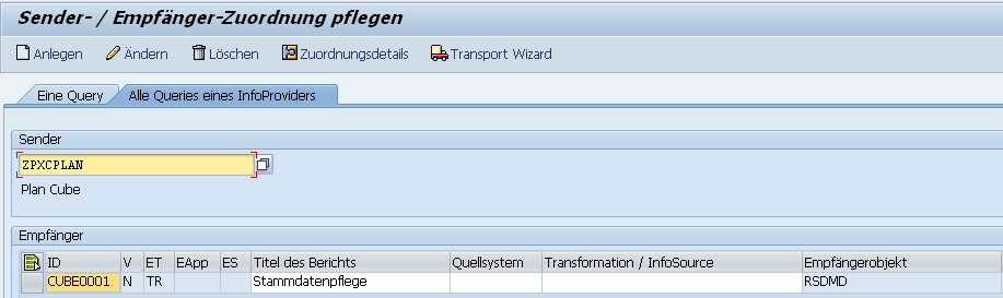 Als Sender können Sie eine bestimmte Query oder alle Queries eines InfoProviders festlegen. In unserem Beispiel wähle ich den Cube ZPXPLAN als Sender aus.
