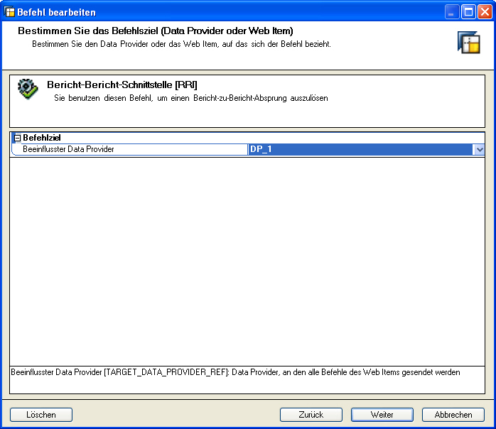 Klicken Sie nun auf Weiter. Als Befehlziel ist der Data Provider auszuwählen, der den Sender enthält. In unserem Fall DP_1.