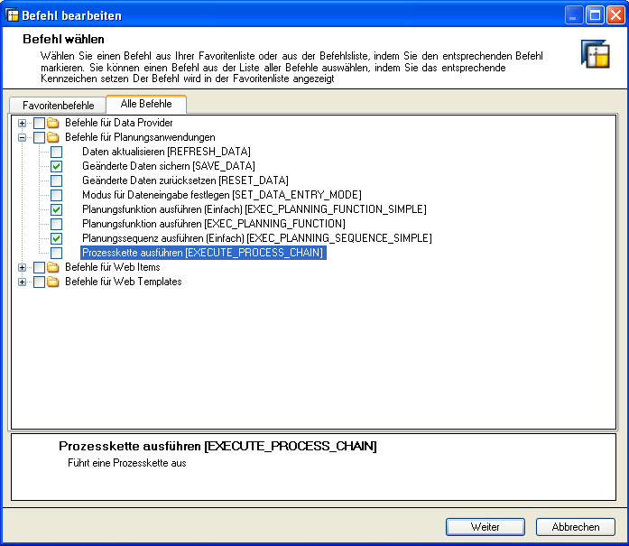 Sichern und aktivieren Sie die Prozesskette. Diese Prozesskette wird ebenso vom WebTemplate aus gestartet. Legen Sie einen Button mit dem Befehl EXECUTE_PROCESS_CHAIN an.